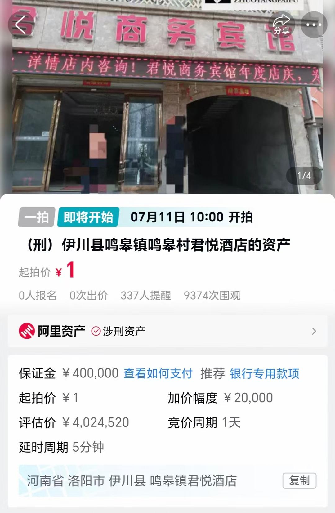 正在阅读:河南一酒店将被1元起拍:系涉刑资产,此前曾因无人出价流拍