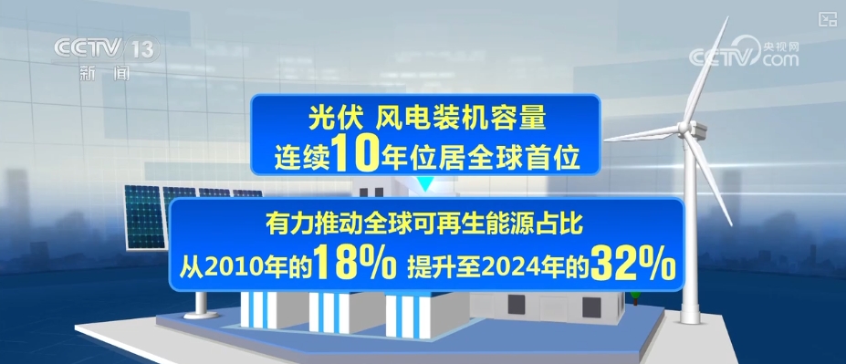 《报告》指出,作为全球最大能源消费国与清洁能源投资国,2024年,中国清洁能源投资规模为6250亿美元,占全球比重的三分之一。光伏、风电装机容量连续10年位居全球首位,有力推动全球可再生能源占比从2010年的18%提升至2024年的32%。