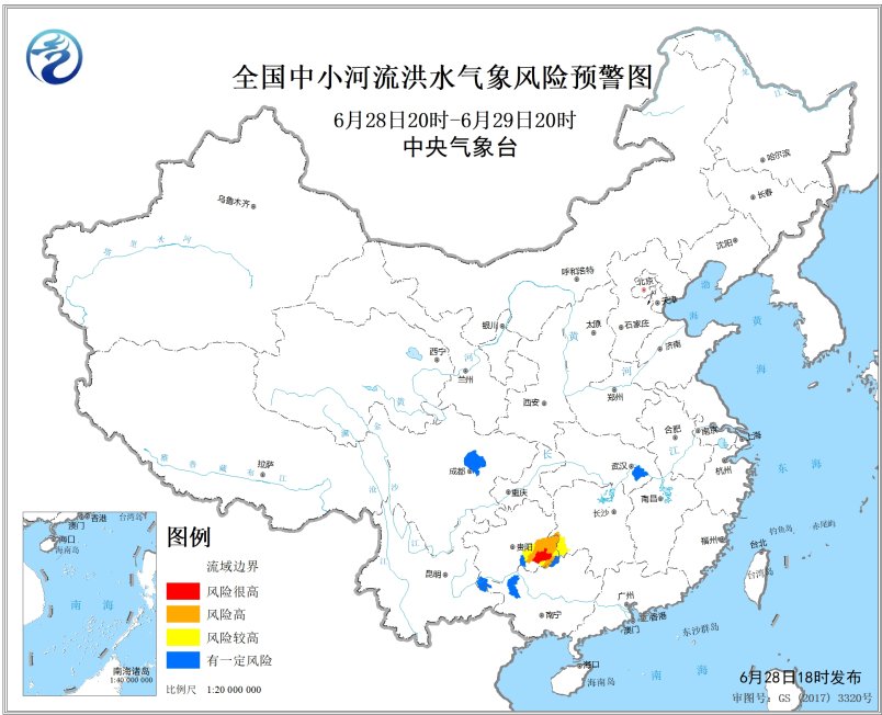 预计,6月28日20时至29日20时,贵州东南部等地部分地区发生中小河流洪水的气象风险高(橙色预警),其中,贵州东南部局地发生中小河流洪水的气象风险很高(红色预警)。请各地密切注意降水引发的中小河流洪水,并做好实时监测、防汛预警和转移避险等防范工作。