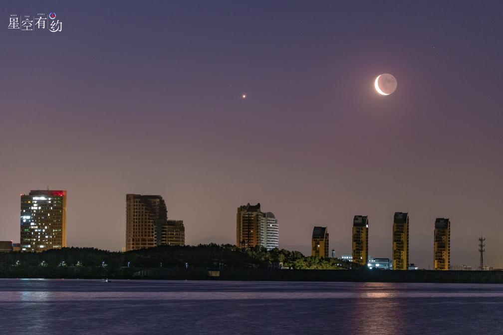 2022年5月27日凌晨在北京怀柔水库拍摄的金星伴月。(周博 摄)