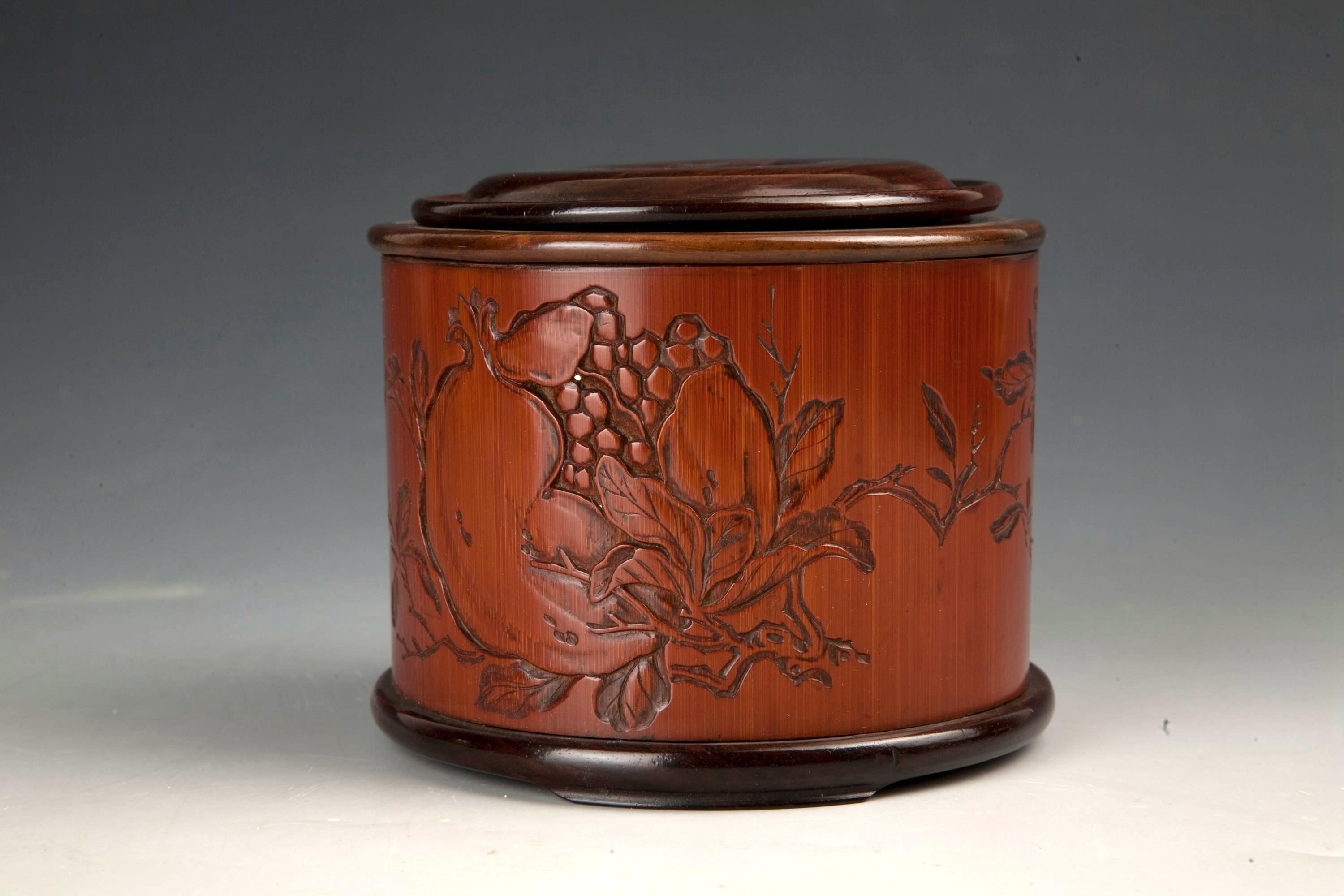 这个竹刻盒上的石榴栩栩如生