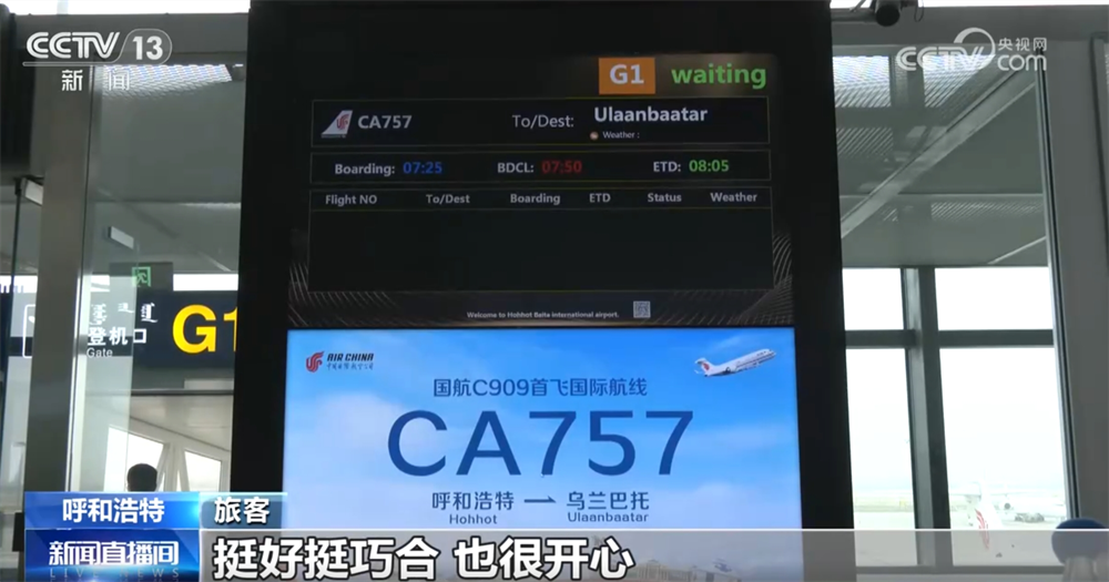 上午8时07分,身披“五星红旗”的CA757航班搭载着74名旅客,从呼和浩特白塔国际机场起飞,前往乌兰巴托国际机场。