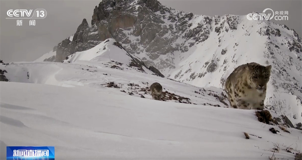 甘肃碌曲:雪豹“遛娃”慢悠悠 一岁幼崽“争”上镜