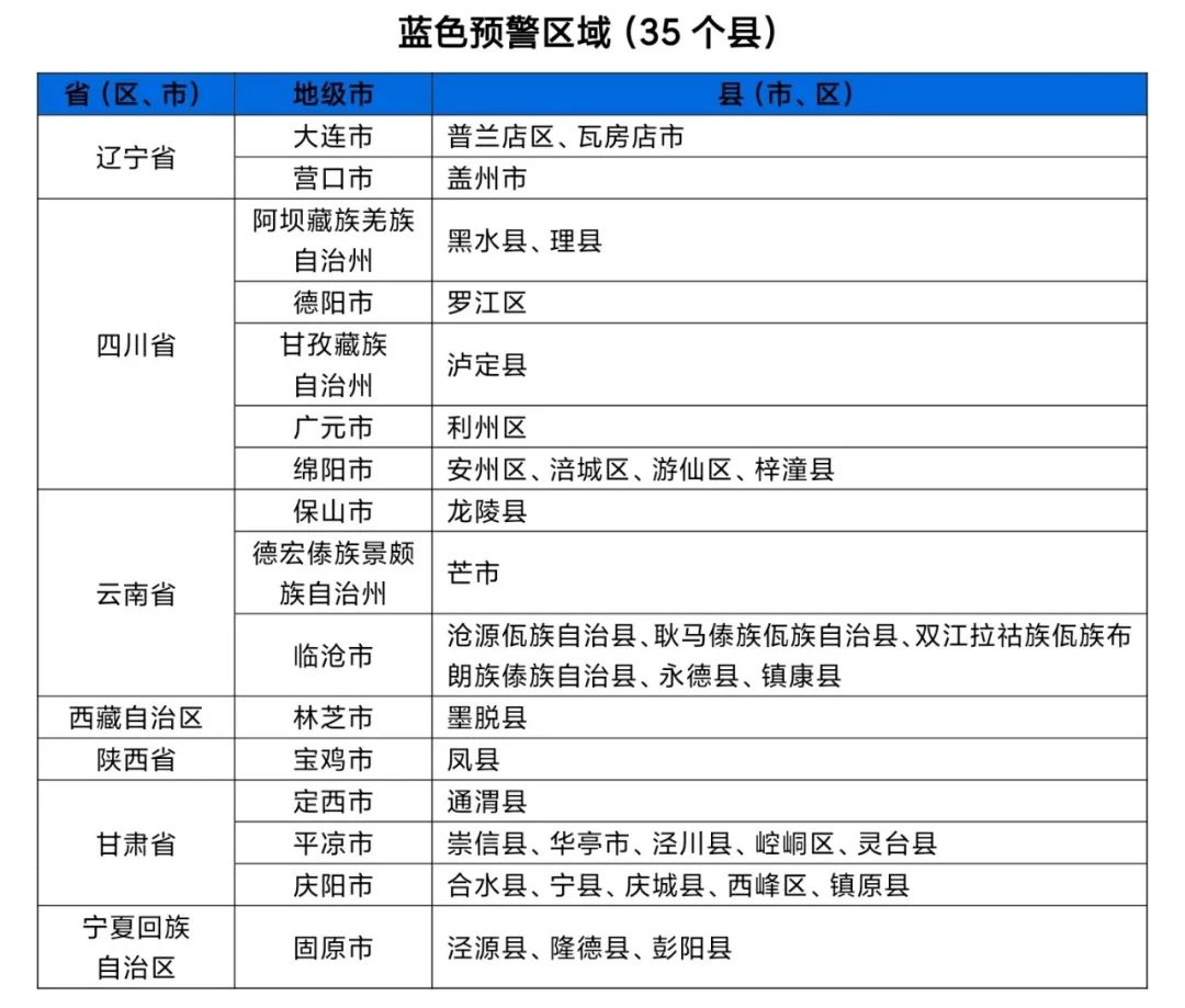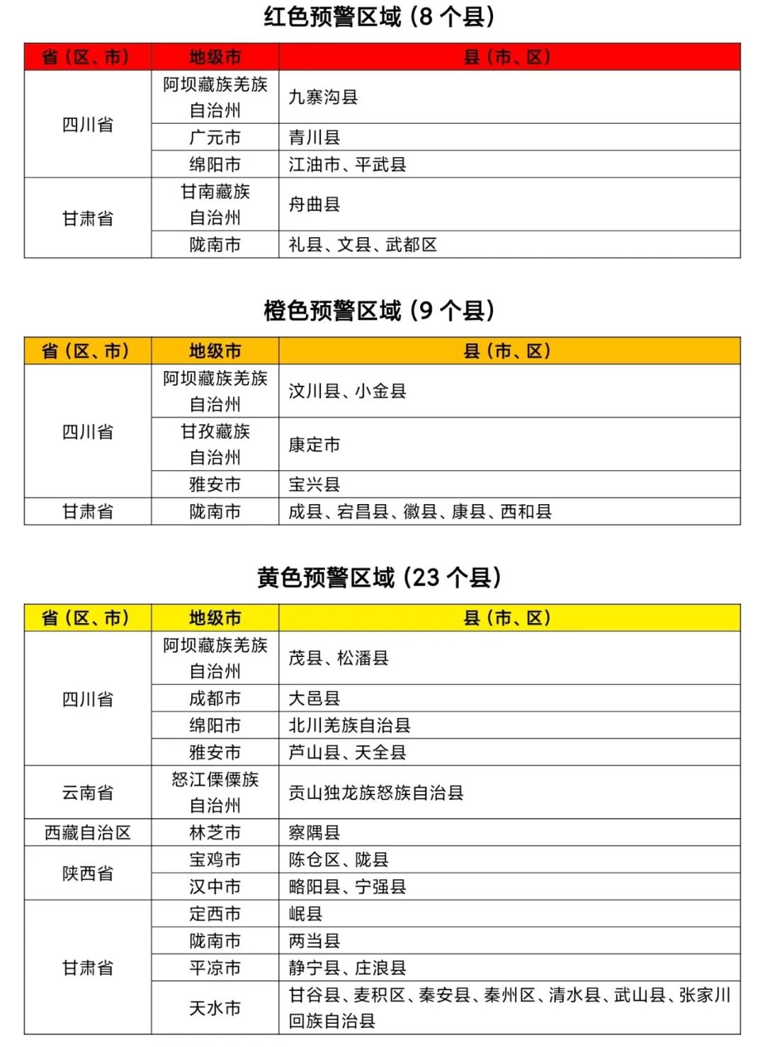 预计,7月2日20时至7月3日20时,四川中部和北部、甘肃南部等地部分地区发生山洪灾害可能性大(橙色预警),其中,四川北部、甘肃南部局地发生山洪灾害可能性很大(红色预警),预警区域涉及的县(市、区)见下表。其他地区也可能因局地短历时强降水引发山洪灾害,请各地注意做好实时监测、防汛预警和转移避险等防范工作。
