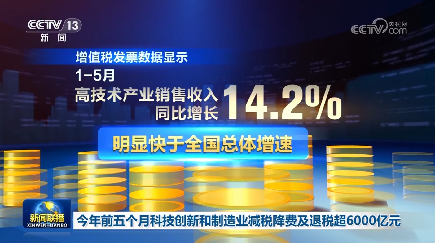 央视网消息(新闻联播):国家税务总局公布的最新数据显示,今年1—5月,支持科技创新和制造业发展的主要政策减税降费及退税达6361亿元。