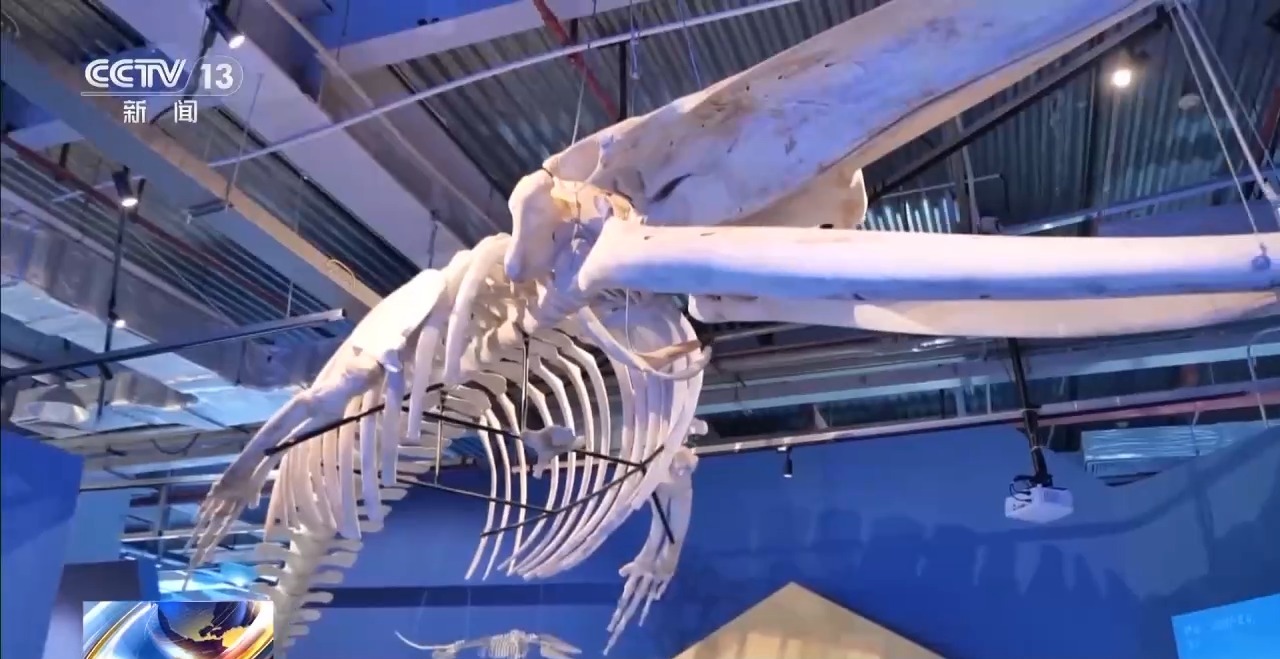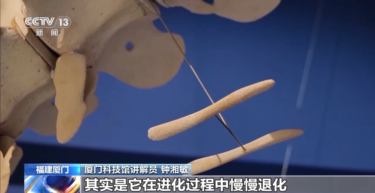 厦门科技馆讲解员 钟湘敏:这边还可以看到一个小彩蛋,就是鲸鱼藏在身体里的后腿,这两个小小的骨头是它在进化过程中慢慢退化,藏在身体的盆骨部分。