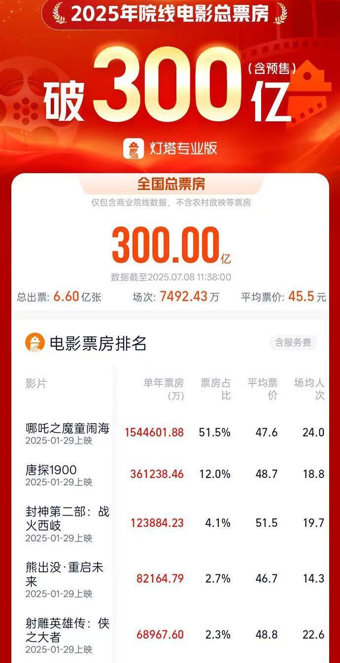 据网络平台数据,截至7月8日11时38分,历时189天,2025年电影大盘票房(含预售)突破300亿,相较去年提前28天。