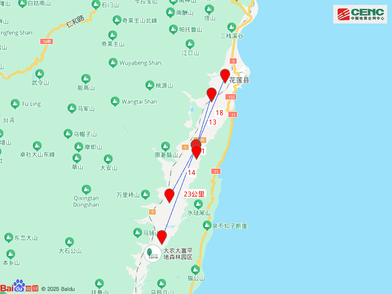 周边县城:震中距寿丰乡1公里、距吉安乡13公里、距凤林镇14公里、距花莲市18公里、距光复乡23公里,距花莲县18公里,距台北市132公里。
