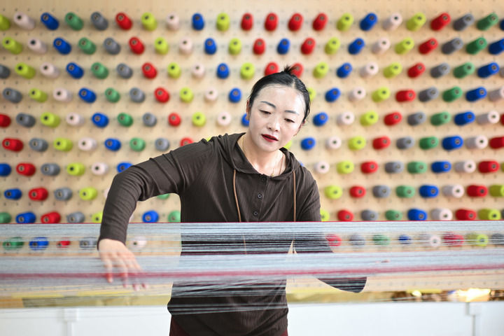 在青海省果洛藏族自治州玛沁县久美家园的“沪沁怡”氆氇手工编织坊内,工作人员卓玛杰在梳经,该工坊由上海援青团队打造(2024年7月19日摄)。新华社记者 张龙 摄