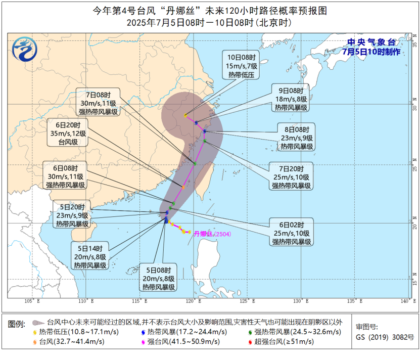 大风预报:7月8日14时至9日14时,东海及钓鱼岛附近海域、台湾以东洋面、浙江沿海、福建沿海、上海沿海、江苏东南部沿海、长江口区、台湾岛沿海、广东东部沿海、台湾海峡、巴士海峡、南海东北部和西南部将有6~7级大风,其中“丹娜丝”中心经过的附近海域和地区风力可达8~9级、阵风10~11级。