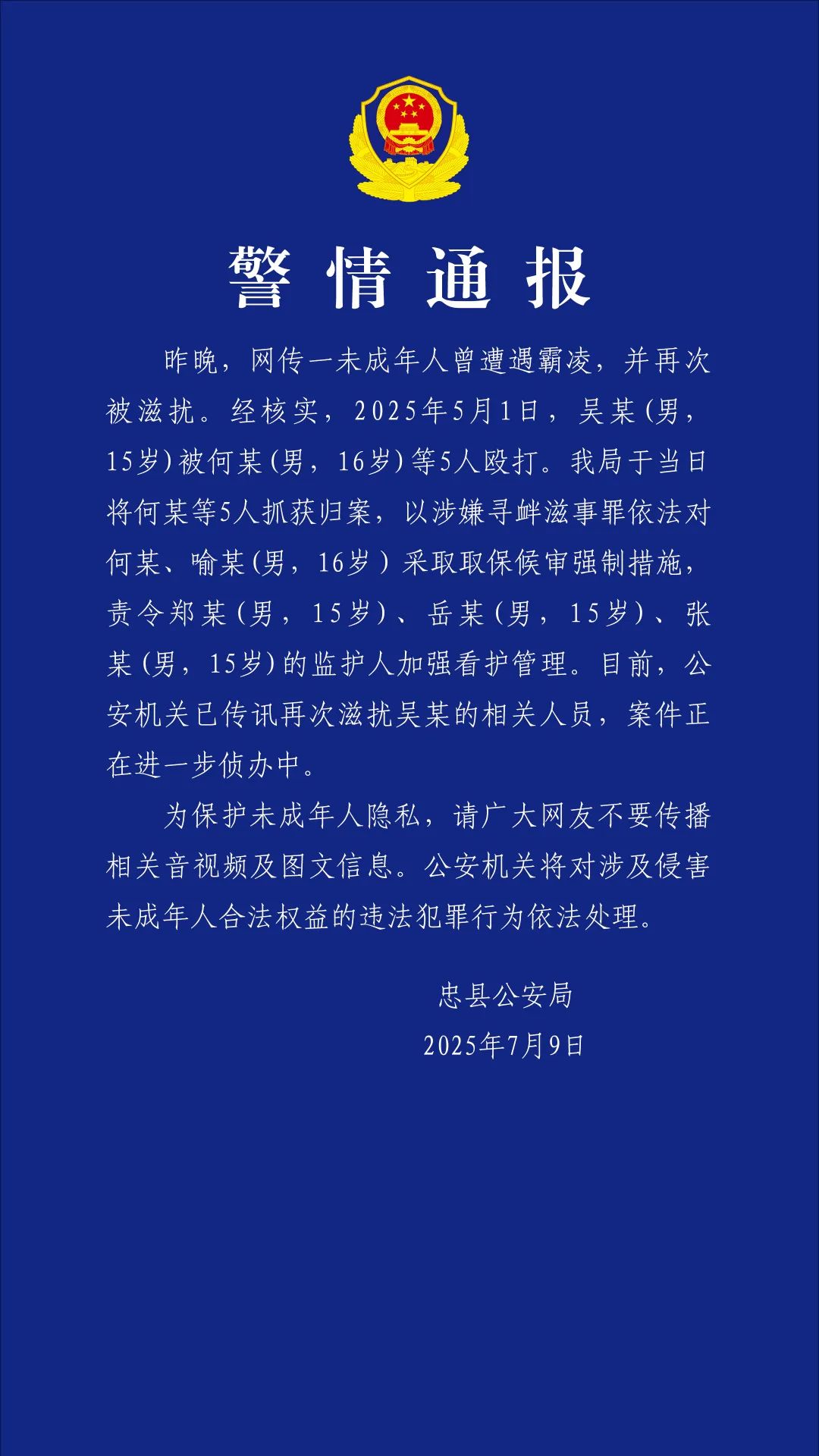 央视网消息:据平安忠县微信公众号消息,7月9日,重庆忠县公安局发布警情通报:网传一未成年人曾遭遇霸凌,并再次被滋扰。经核实,2025年5月1日,吴某(男,15岁)被何某(男,16岁)等5人殴打。该局于当日将何某等5人抓获归案,以涉嫌寻衅滋事罪依法对何某、喻某(男,16岁)采取取保候审强制措施,责令郑某(男,15岁)、岳某(男,15岁)、张某(男,15岁)的监护人加强看护管理。目前,公安机关已传讯再次滋扰吴某的相关人员,案件正在进一步侦办中。