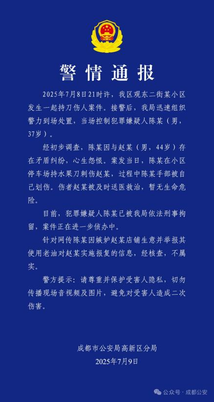 ·成都高新警方通报持刀伤人案件:因矛盾心生怨恨,伤者无生命危险。