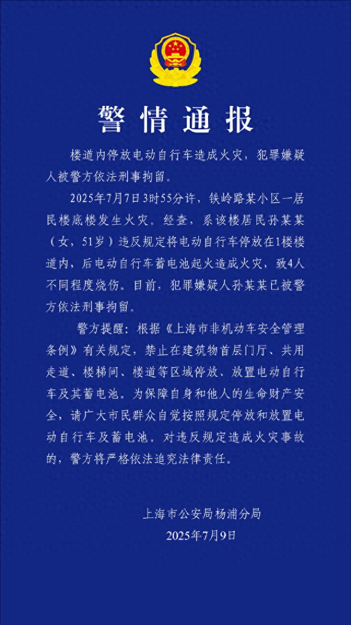 ·一楼楼道内电动自行车起火致4人烧伤,违规停车女子被刑拘。