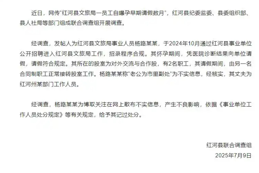 ·云南一女子自曝怀孕期间摆烂上班丈夫是市副处?官方通报:当事人因发布不实信息被给予记过处分。