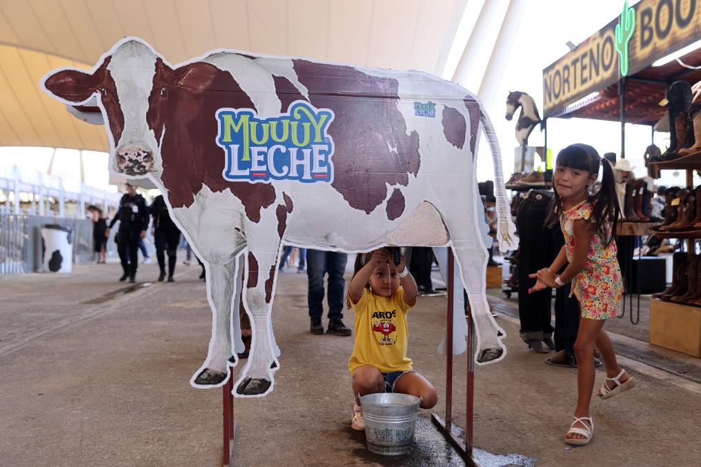 5月7日,在墨西哥阿瓜斯卡连特斯举行的圣马科斯博览会畜牧展上,一名小女孩体验挤牛奶游戏。新华社记者李梦馨摄