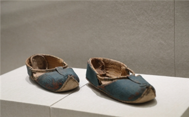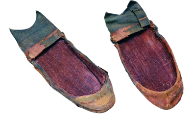 △ 唐·蓝色如意鞋,1968年吐鲁番阿斯塔那104号墓出土,新疆维吾尔自治区博物馆藏。鞋面为蓝丝绢质,鞋底为白色,鞋头微微翘起,鞋帮至鞋上部用棉条搭缝两条绳,既牢固鞋面,又起到装饰作用。该鞋形制类似今天的凉鞋,适合夏季穿着。