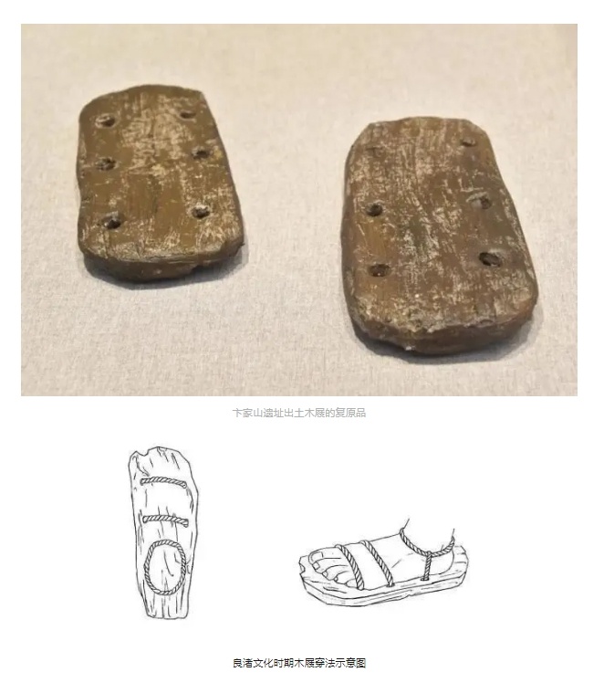 △卞家山遗址发现的良渚文化时期木屐(复原品)及穿法示意图,良渚博物院藏。