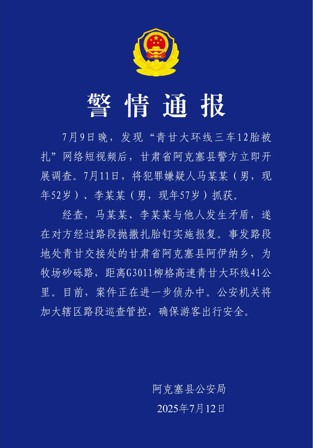 通报称,7月9日晚,发现“青甘大环线三车12胎被扎”网络短视频后,甘肃省阿克塞县警方开展调查。7月11日,将犯罪嫌疑人马某某(男,现年52岁)、李某某(男,现年57岁)抓获。