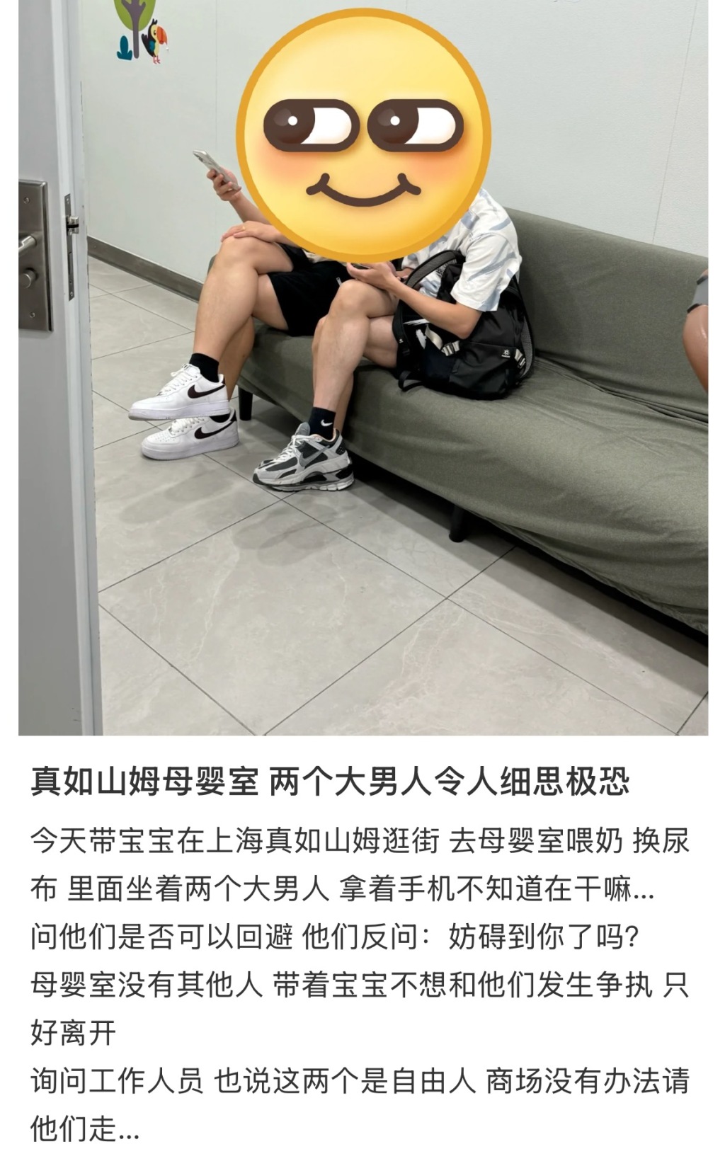 近日,一位妈妈在社交平台发帖称去上海真如山姆超市母婴室喂奶、换尿布,看见两位男子坐在沙发上看手机,当询问是否能回避时却遭对方反问“妨碍到你了吗?” 后续找到工作人员反映求助,工作人员表示无权强制二人离开,涉事妈妈在帖子中呼吁优化商场母婴室的管理。