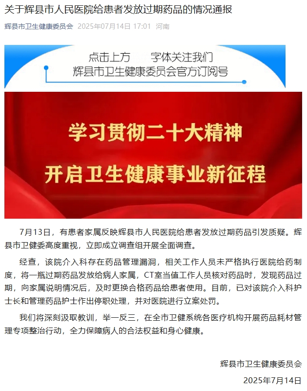 央视网消息:7月14日,辉县市卫生健康委员会就辉县市人民医院给患者发放过期药品情况发布通报:7月13日,有患者家属反映辉县市人民医院给患者发放过期药品引发质疑。辉县市卫健委高度重视,立即成立调查组开展全面调查。