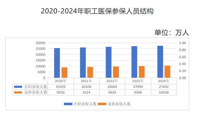 公报显示,截至2024年底,职工医保参保37948.34万人,比上年增加853.70万人,增长2.3%。其中在职职工27491.84万人,退休职工10457.50万人。