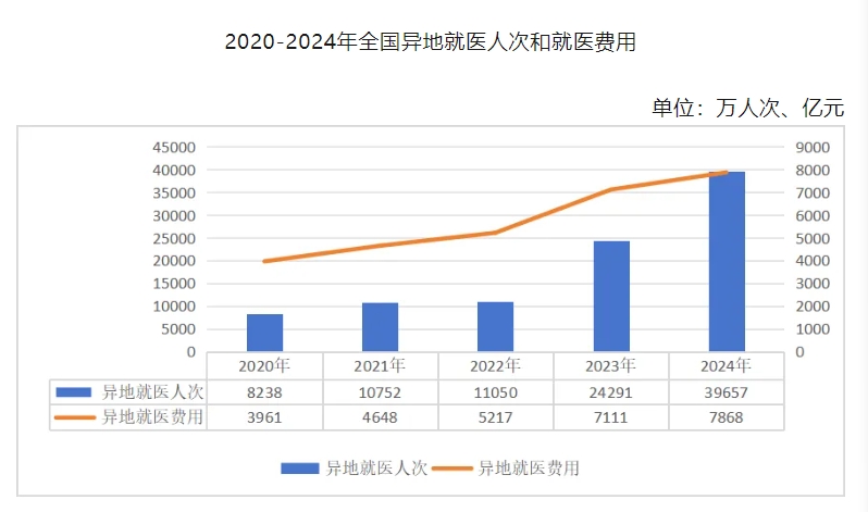 数据显示,2020年至2024年间,全国异地就医人次和就医费用呈增长态势。(完)