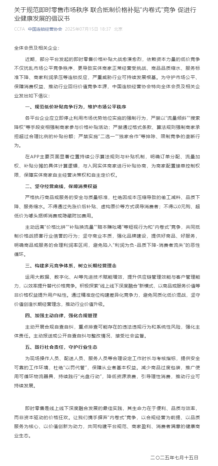 正在阅读:中国连锁经营协会倡议:规范即时零售市场秩序,联合抵制价格补贴“内卷式”竞争