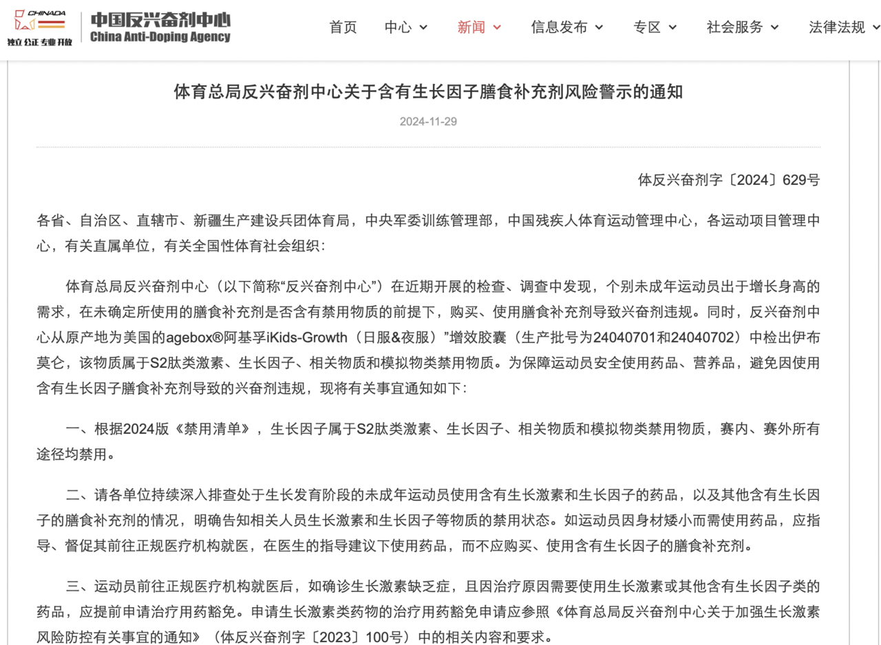 吴女士所说的这个通知来源于国家体育总局反兴奋剂中心。2024年11月29日,该中心发布《关于含有生长因子膳食补充剂风险警示的通知》(体反兴奋剂字〔2024〕629号),指出在“阿基孚iKids-Growth增效胶囊”(批号24040701、24040702)中检出禁用物质“伊布莫仑”。该物质属于S2肽类激素、生长因子、相关物质和模拟物类禁用物质,比赛内外所有用途均禁用。