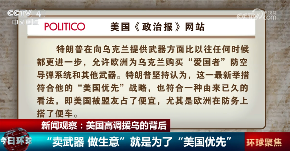 央视网消息:“卖武器,做军火生意”,这也是美国总统特朗普近两天一再强调的,他称通过北约向乌克兰提供“爱国者”系统等武器,符合其一贯坚持的“美国优先”原则。美国国防部分析师直言,这么做还可以进一步消耗其他北约国家的资源。