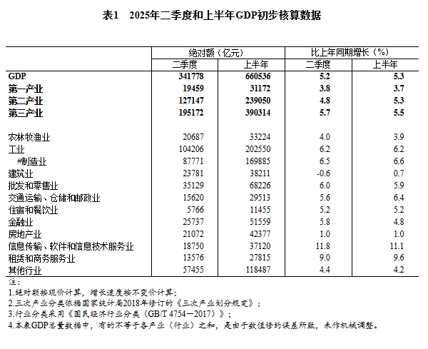 据国家统计局网站消息,根据有关基础资料和国内生产总值(GDP)核算方法,经初步核算,我国2025年二季度和上半年GDP核算结果如下。