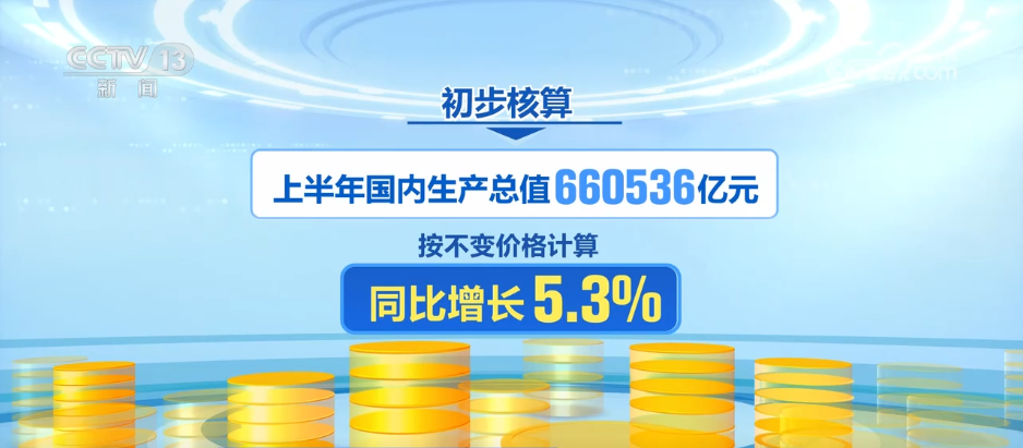 初步核算,上半年,国内生产总值660536亿元,按不变价格计算,同比增长5.3%。分产业看,第一产业增加值同比增长3.7%;第二产业增加值同比增长5.3%;第三产业增加值同比增长5.5%。分季度看,一季度国内生产总值同比增长5.4%,二季度增长5.2%。