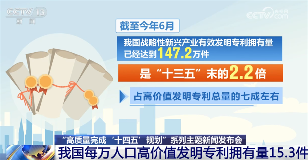 央视网消息:国新办7月17日举行“高质量完成‘十四五’规划”系列主题新闻发布会。发布上,国家知识产权局有关负责人介绍,“每万人口高价值发明专利拥有量”是“十四五”时期经济社会发展的主要预期性指标之一,截至今年6月,已经达到15.3件,提前实现“十四五”规划预期的12件目标。