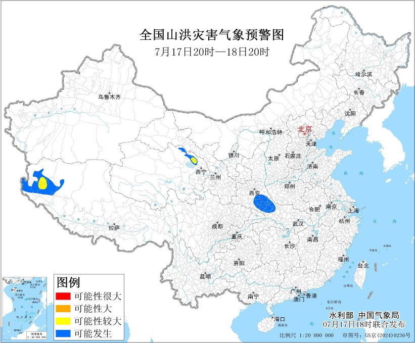 央视网消息:水利部和中国气象局7月17日18时联合发布黄色山洪灾害气象预警:预计,7月17日20时至18日20时,青海东北部、西藏西部、湖北西北部、陕西东南部等地部分地区可能发生山洪灾害(蓝色预警),其中,西藏西部、青海东北部等地部分地区发生山洪灾害可能性较大(黄色预警)。其他地区也可能因局地短历时强降水引发山洪灾害,请各地注意做好实时监测、防汛预警和转移避险等防范工作。