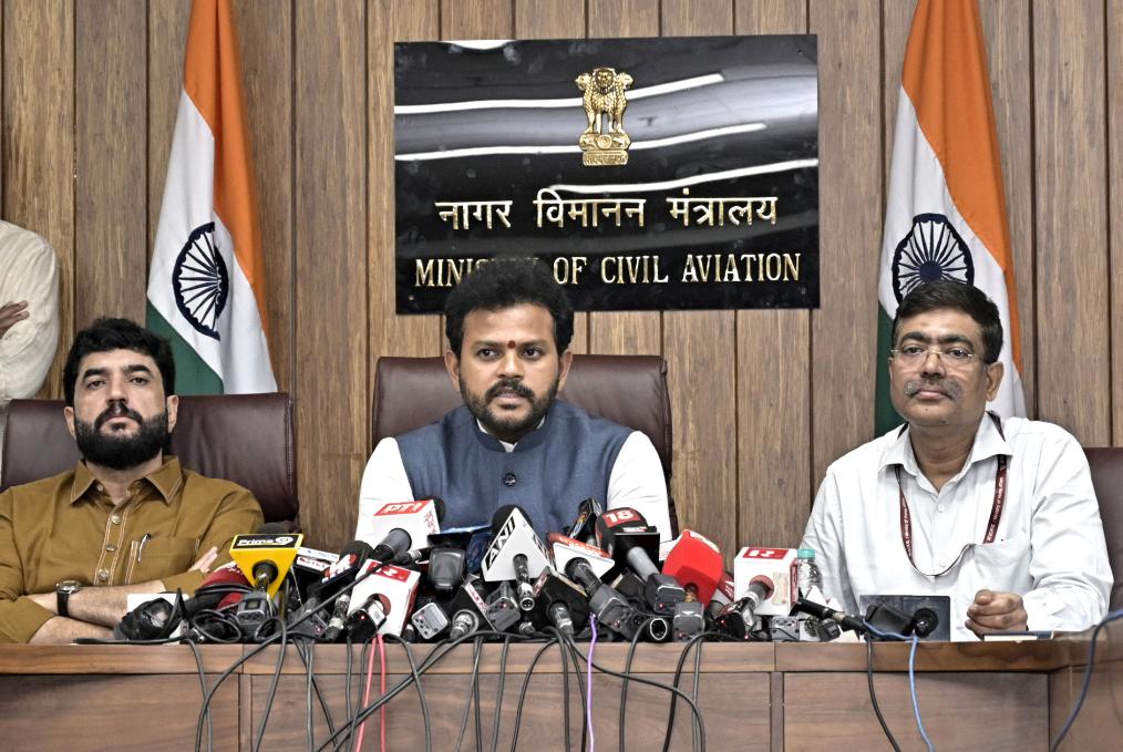 6月14日,印度航空部长拉姆·莫汉·奈杜(中)在新德里出席新闻发布会。新华社发(印度政府新闻信息局供图)