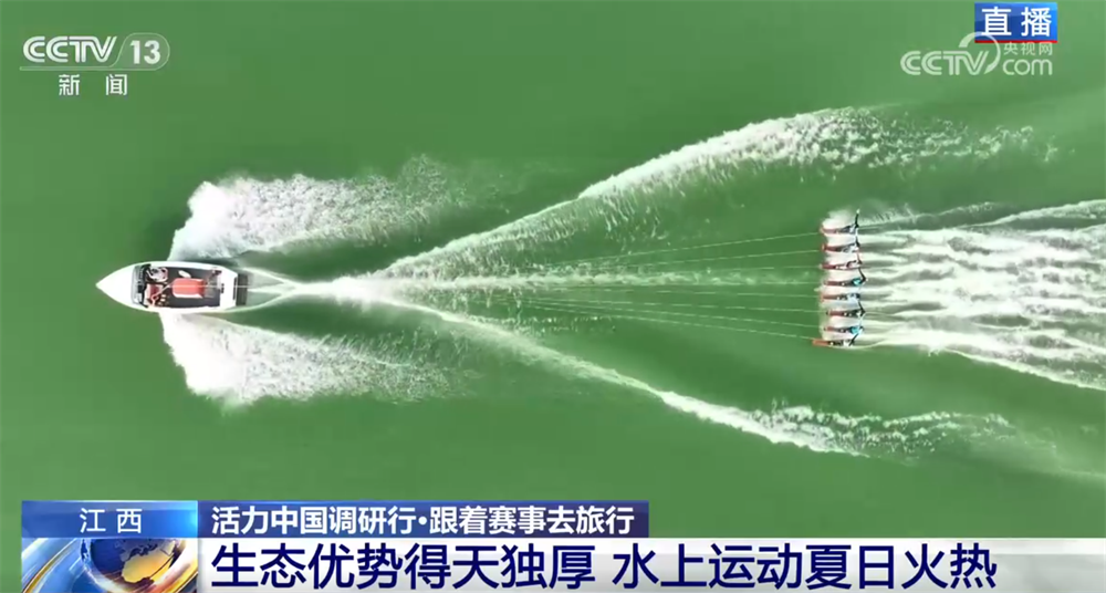 正值暑期,我们看到也有不少游客来到这里体验帆船、桨板等水上项目。而这片水域也是江西省滑水运动队的训练基地,此刻队员们正在进行的是艺术滑水的训练,怎么样,是不是隔着屏幕就能感到一份清凉和刺激?