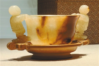康熙年间制的白玉双婴耳杯,造型饶有宋风,采用了“琥珀烫”沁色做旧技法,曾使乾隆无法分辨真假,以为是汉代之物,倍加赏玩。后经苏州籍玉工姚宗仁辨识,方才揭开谜底,乾隆这才恍然大悟,原来此杯为祖父命工匠所做的伪古器。这件事令乾隆大呼神奇,甚感有趣,他为此写下《玉杯记》一文,制成册页,还专门配上檀香木座、黑漆描金漆盒。如今,这一套相关文物被特意安放在一个独立的玻璃柜中,供今天的观众细品三百年前的祖孙轶事。由此,我们也得出一个教训,高级业余毕竟还是业余,诚如乾隆这般收藏与过眼,仍会踩到坑里。高人往往出自身经百战的工匠。