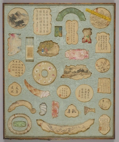这套百什件初装于乾隆九年,当时箱内摆了9层44屉玉器,共498件。屉盒内均糊月白绫并挖随形槽,槽内或书或画,屉中还附双层锦,一面绘本匣内玉器图画,另一面绘山水或花鸟画。琳琅笥的玉器多为不同时代的古玉及仿古玉,上至新石器,下至清代。受限于内匣的高度,所贮玉器多为片状小件,器型有璧、环、璜、佩、剑饰等,堪称一部小型的中国古代玉器史。