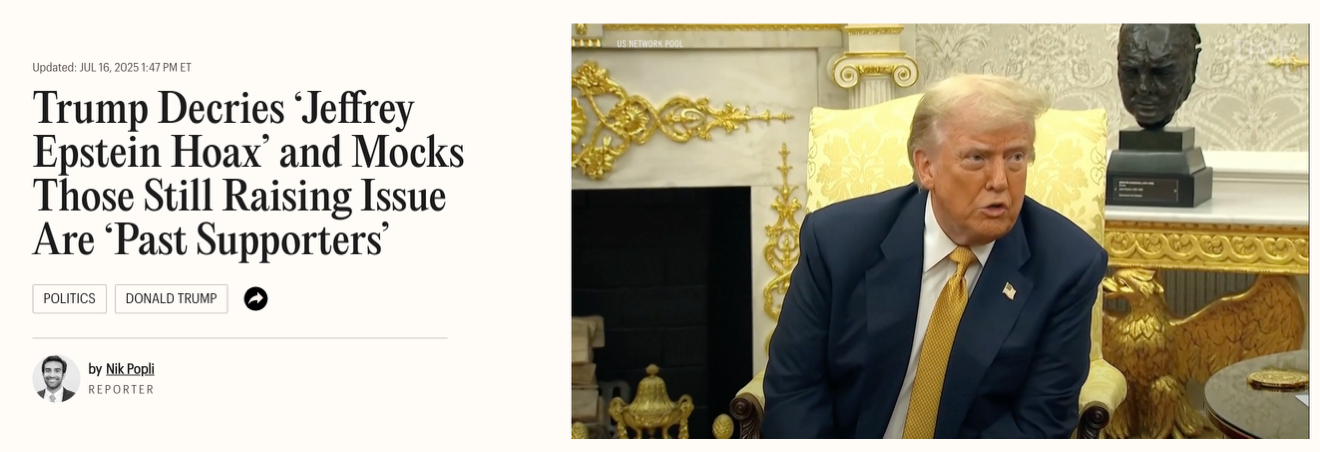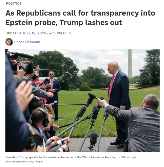 △美媒报道称,当地时间7月16日,针对共和党内一些仍在要求公布更多爱泼斯坦资料的成员,特朗普进行了严厉抨击。