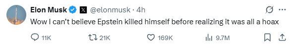 △马斯克发帖称“真不敢相信爱泼斯坦在意识到这是个骗局之前就自杀了。”