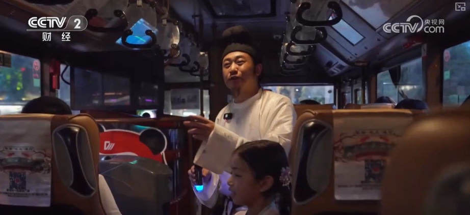 讲解员化身为“城市说书人”,全程为游客讲解沿途的多个景点地标和历史典故。游客们不仅可以饱览窗外流光溢彩的夜景,还可以和身穿汉服的小朋友一起参与“飞花令”挑战,领取精美文创礼品,收获不一样的夜游体验。