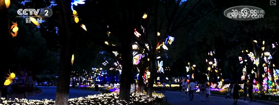 夜幕降临,上海野生动物园的入园口、月亮湾等区域附近,以昆虫为主题的灯光秀,吸引了不少游客拍照打卡。
