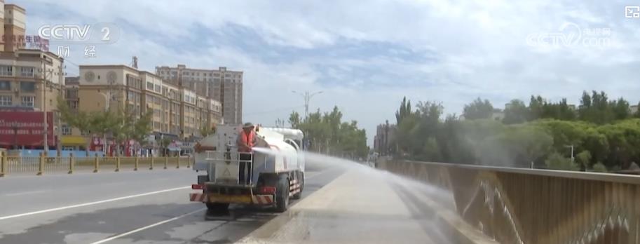 新疆巴楚县住建局市政服务中心工作人员 开维赛尔·努尔买买提:我们每天早晨、中午、晚上对县城区29条道路开展3次洒水作业,每周对护栏、路沿石、公交车站、桥木、灌木等进行冲洗,在切实减少灰尘污染的同时,起到一定降温消暑作用。