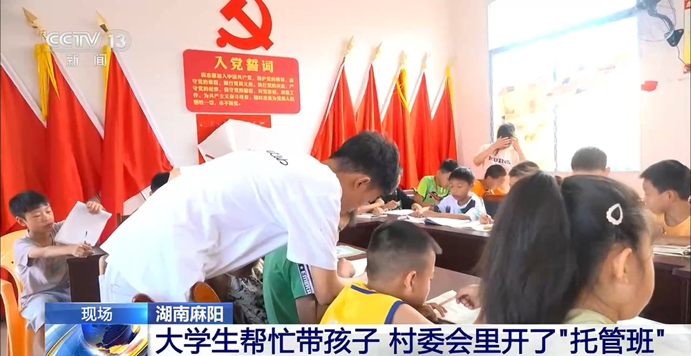 央视网消息:暑假里,儿童的“看护空窗期”,不仅是城市上班族的困扰,也是不少农村家庭的烦恼。在湖南怀化市麻阳县文昌新村,村委会专门腾出会议室,办起了免费托管班,并邀请返乡的大学生担当“班主任”,为村里留守儿童提供安全教育、学业帮扶等关爱活动。