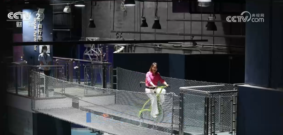 记者体验空中蹬自行车走钢丝,奥秘就在自行车下方一个非常重的物体上,通过它的配重,整个重心变得非常低,会保持稳定的状态。即便看到有些晃动,但都是非常平稳。