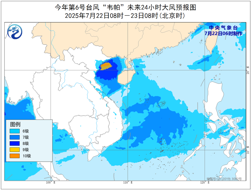 今天,受“韦帕”和西南季风的共同影响,我国华南沿海及南部部分海域有6~7级风,阵风8~9级,其中北部湾、广西沿海、海南岛西部沿海的风力可达8~9级,阵风10~11级,北部湾部分海域风力有10级,阵风11~12级。中央气象台今晨继续发布台风黄色预警。