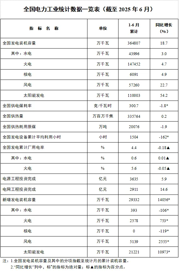 截至6月底,全国累计发电装机容量36.5亿千瓦,同比增长18.7%。其中,太阳能发电装机容量11.0亿千瓦,同比增长54.2%;风电装机容量5.7亿千瓦,同比增长22.7%。1-6月份,全国发电设备累计平均利用1504小时,比上年同期降低162小时。