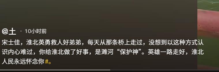 7月20日晚,安徽淮北市相山区当地人称为黄里大桥的桥边,30岁的宋士佳将落水的一家三口推上岸后,自己却因体力不支沉入水中。23日,宋士佳的亲友们介绍,宋士佳水性不好,朋友劝他不要下水,但他还是毅然地去救人。
