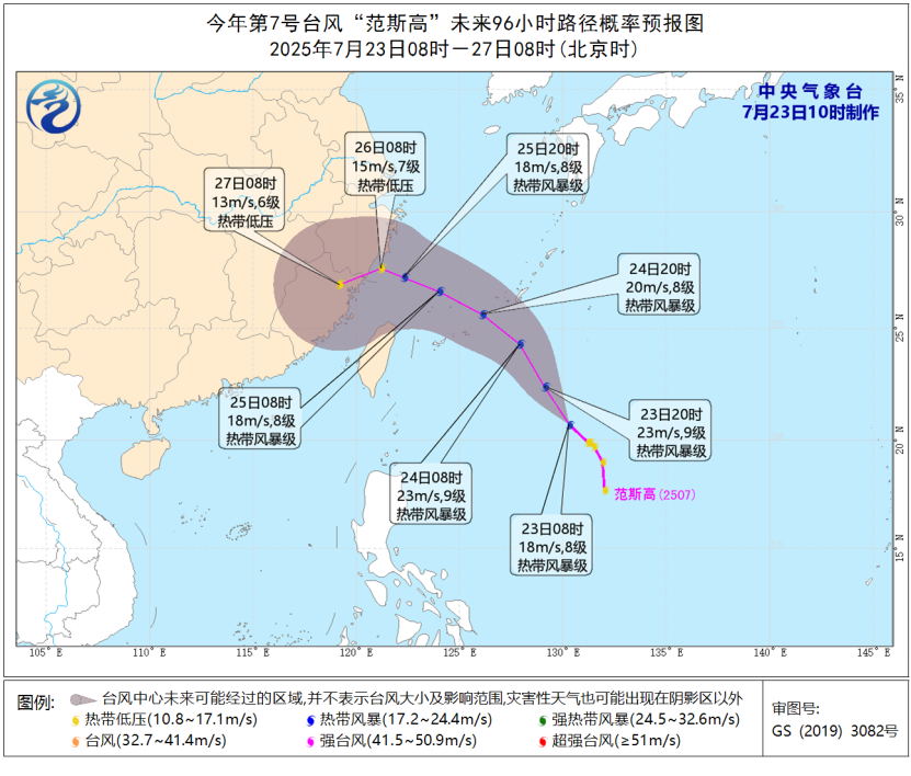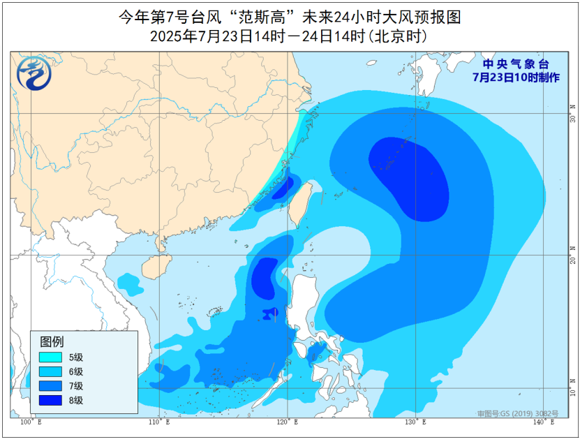 大风预报:7月23日14时至24日14时,受“范斯高”和西南季风的共同影响,东海大部海域、台湾海峡、浙江中南部沿海、福建沿海、台湾以东洋面、巴士海峡、南海东部和南部海域将有5~7级、阵风8~9级大风,其中,台湾海峡、巴士海峡、东海东部、南海东部的部分海域风力可达8级、阵风9~10级。