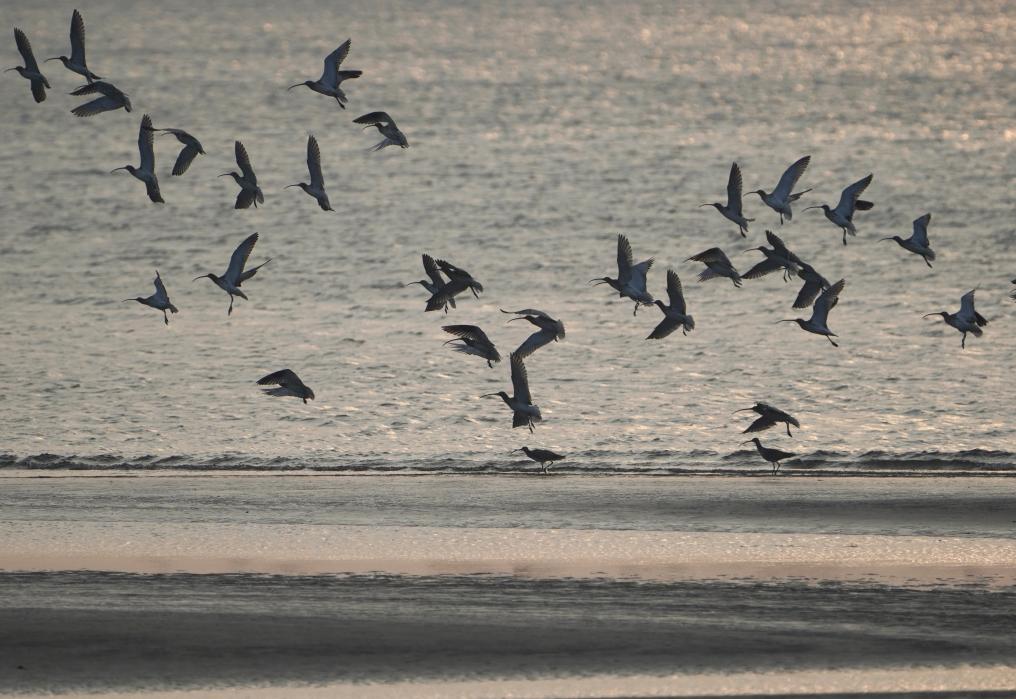 这是冬季时节候鸟在广西防城港市港口区企沙镇的山心沙岛附近翩翩起舞。新华社记者 周华 摄