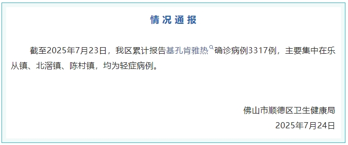 据“健康顺德”公众号消息,广东佛山市顺德区卫生健康局发布情况通报,截至7月23日,顺德区累计报告基孔肯雅热确诊病例3317例,主要集中在乐从镇、北滘镇、陈村镇,均为轻症病例。